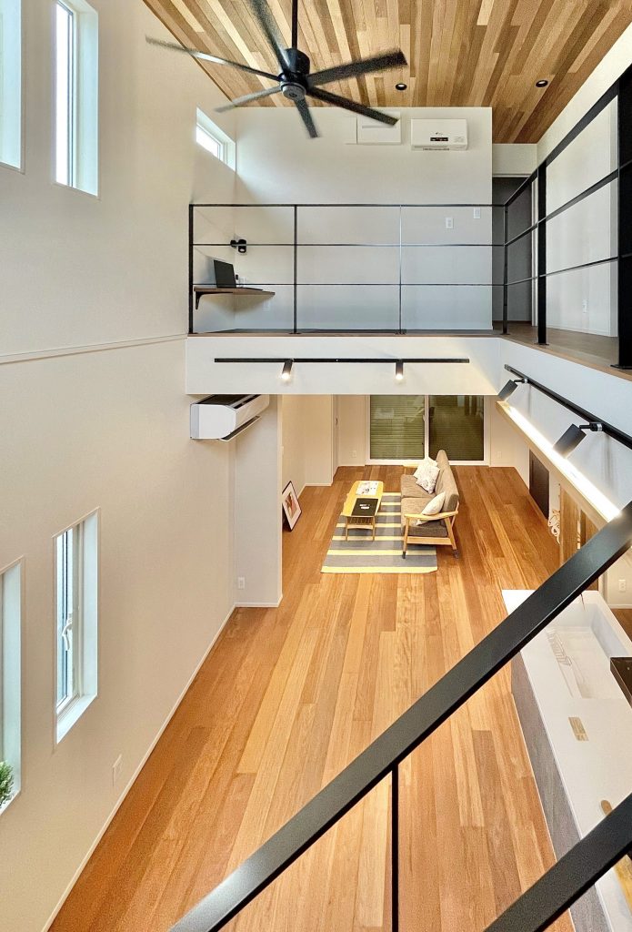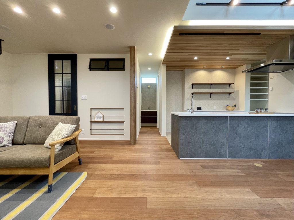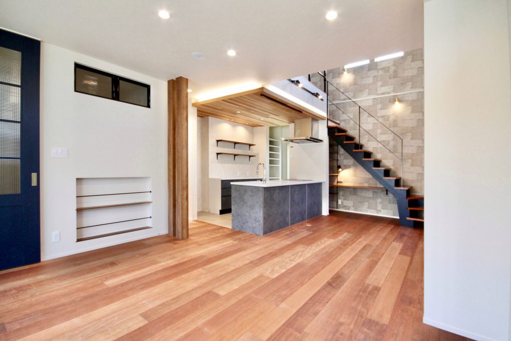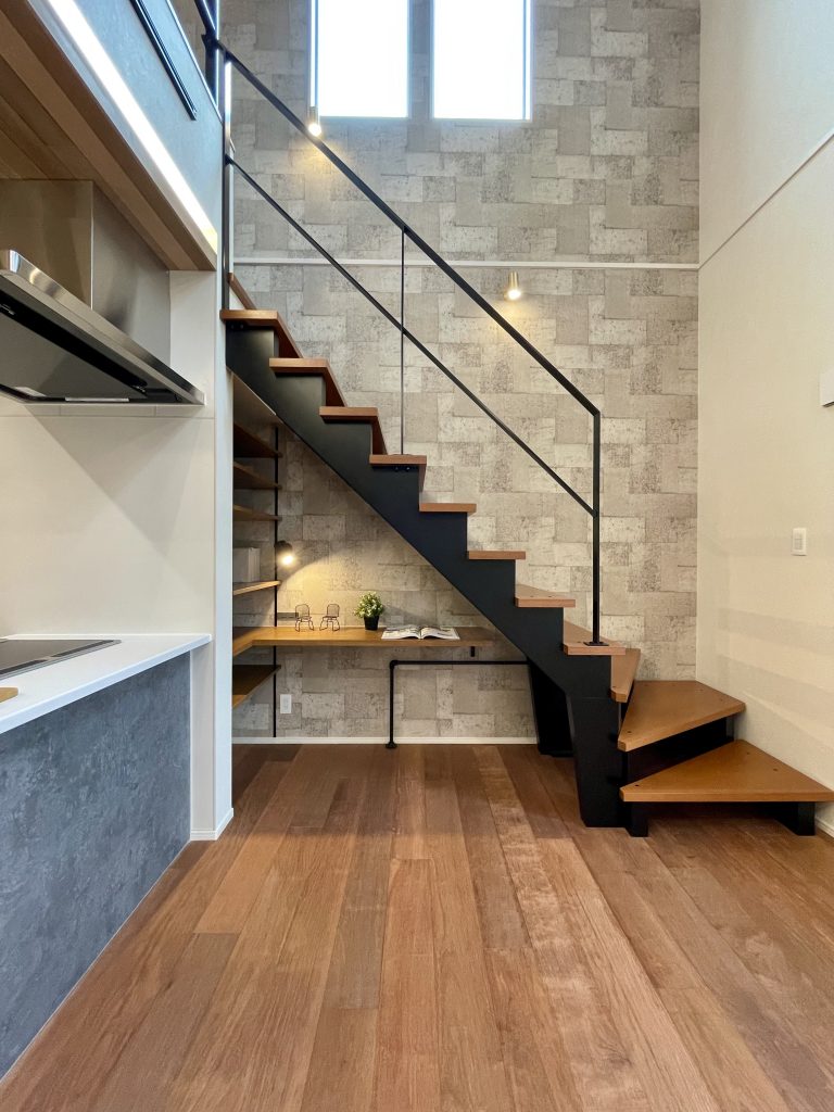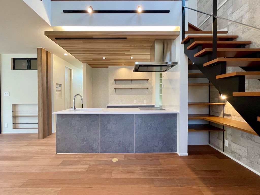 格調高いテイストが重圧さを感じさせる、インダストリアルモダンデザイン 脱衣所と分けられた造作洗面台 キッチンはフルフラット 下がり天井と間接照明で落ち着いた空間に 階段下を有効活用したカウンター LDKの吹き抜けで自然と光が注ぎ、家全体が明るい印象に 関連